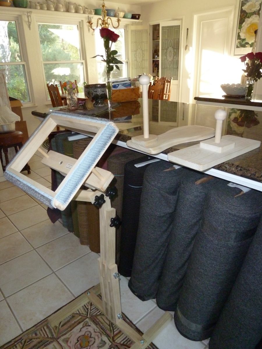 This is an almost-unused Purple Crow Rug Hooking Frame that comes with Floor Stand, Sit-on Stand and Lap/Tabletop Stand. It is a 360 degree rotating frame with tilt and the floor stand is fully adjustable for height and dismantles easily for travel. Great buy on a wonderful frame.